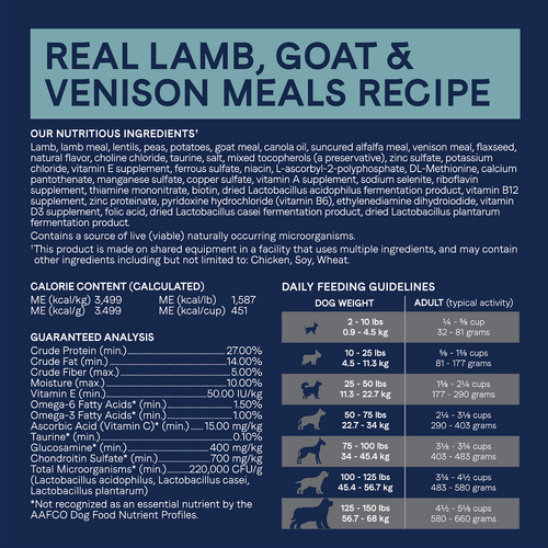 Lamb, lamb meal, lentils, peas, potatoes, goat meal, canola oil, suncured alfalfa meal, venison meal, flaxseed, natural flavor, choline chloride, taurine, salt, mixed tocopherols (a preservative), zinc sulfate, potassium chloride, vitamin E supplement, ferrous sulfate, niacin, L-ascorbyl-2-polyphosphate, methionine supplement, calcium pantothenate, manganese sulfate, copper sulfate, vitamin A supplement, sodium selenite, riboflavin supplement, thiamine mononitrate, biotin, dried Lactobacillus acidophilus fermentation product, vitamin B12 supplement, zinc proteinate, pyridoxine hydrochloride (vitamin B6 supplement), ethylenediamine dihydroiodide, vitamin D3 supplement, folic acid, dried Lactobacillus casei fermentation product, dried Lactobacillus plantarum fermentation product. Contains a source of live (viable) naturally occurring microorganisms.