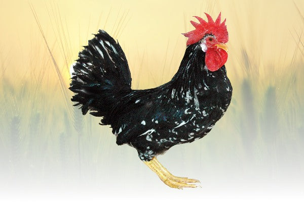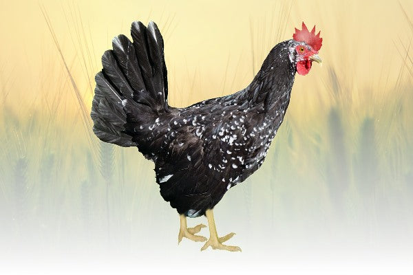 The Ancona is an old Italian breed that is known for its ability to lay lots of white-shelled eggs. They are a lightweight breed that can have either a single or rose comb. The males develop long flowing tail feathers that make them especially eye-catching. The plumage is black with white-tipped feathers, this is known as mottling. With each molt, birds tend to get whiter. They are active birds, are great foragers, and thanks to their smaller size they eat less than larger breeds.